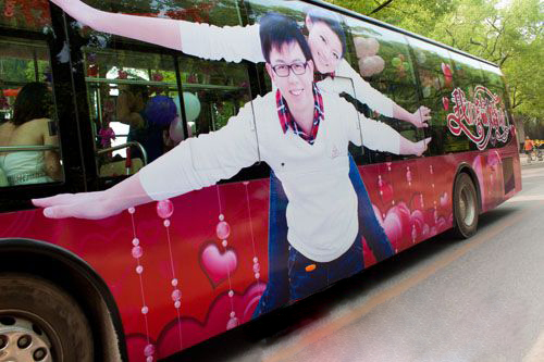 巨幅照片被印上车身,这是为新人打造的专属“幸福大巴”